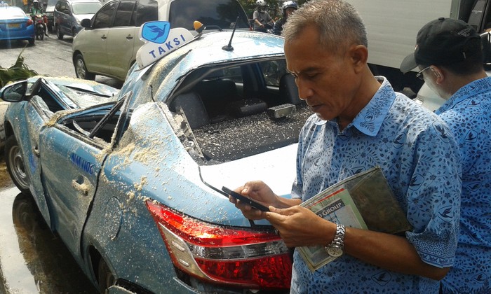 "Saya lagi di dalam, tapi Alhamdulilah nggak kenapa-kenapa. Yang hancur di bagian kiri. Untung saya mundur sedikit," ujar Trimaizon di samping taksinya yang ringsek di Jl Taman Kebon Sirih I, kelurahan Kampung Bali, Tanah Abang, Jakarta Pusat, Selasa (30/8/2016).