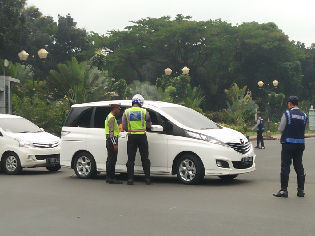 Polisi menghentikan laju mobil yang berpelat ganjil. "Yang ditilang banyak. Tadi pagi saja dapat 3 buku," ujar salah seorang polisi yang lagi sibuk menilang pengemudi.