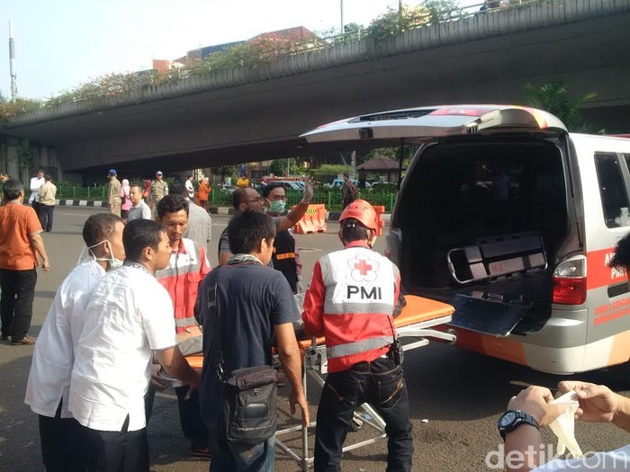 Terpantau di lokasi, Kamis (1/9/2016), seorang pria dibawa petugas Palang Merah Indonesia (PMI) ke dalam mobil ambulans setelah jatuh dan digotong warga ke trotoar pinggir jalan. Pria itu berusia sekitar 45 tahun.