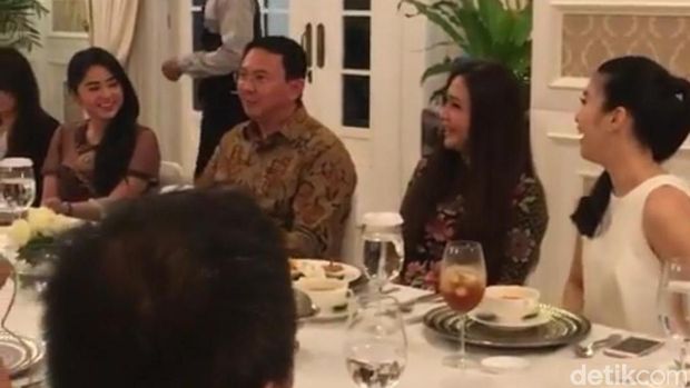 Dalam video unggahan akun Instagram 'timbtp', terlihat Ahok mengenakan kemeja batik cokelat. Maia Estianti mengenakan baju hitam bunga-bunga duduk di samping kanan Ahok, Dewi Persik mengenakan baju lengan pendek duduk di samping kiri Ahok. Nampak aktris Sandra Dewi berbaju putih juga ada di situ.