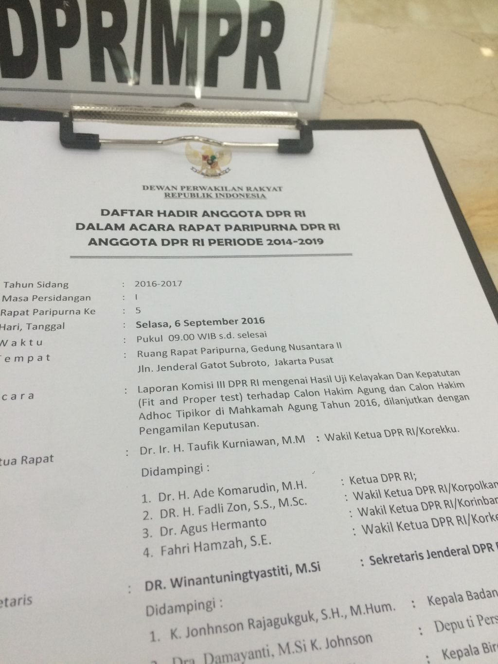Daftar hadir anggota DPR RI di paripurna 6 September 2016 hari ini (Tiara/detikcom)