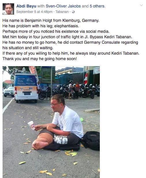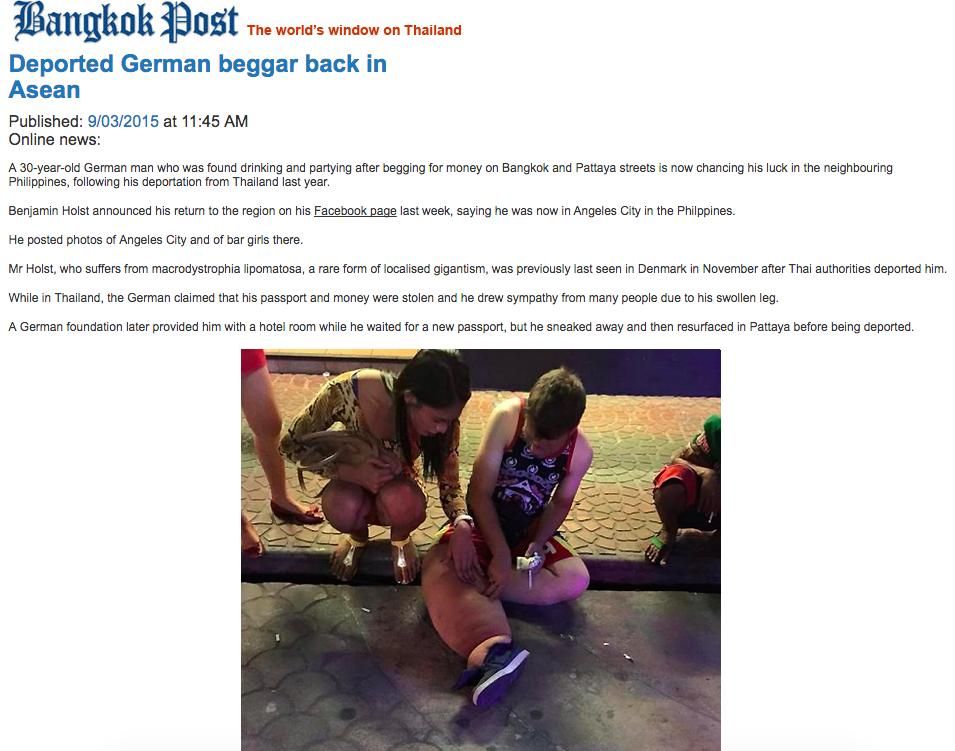 Bangkok Post edisi 9 Maret 2015 menulis "Deported German beggar back in Asean"