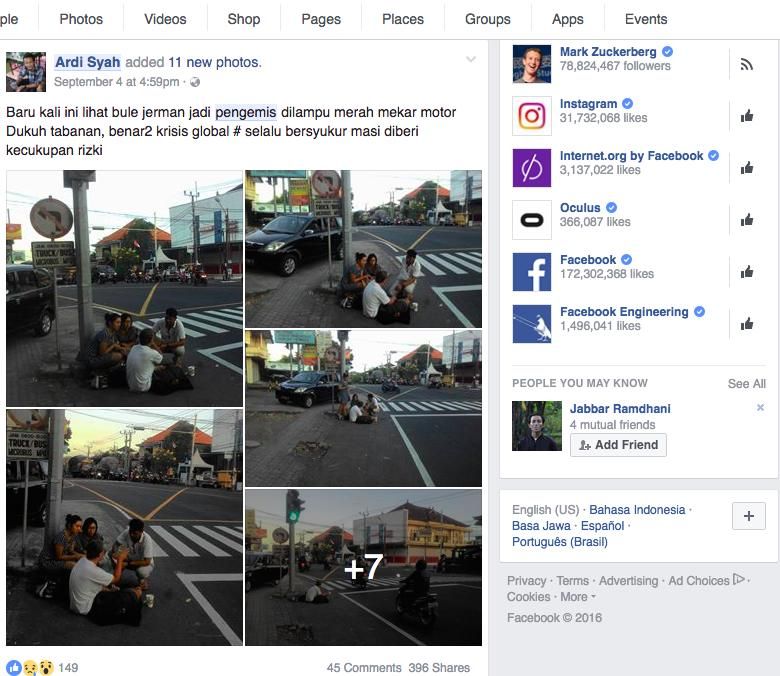 Dalam postingan Minggu, 4 September 2016, pengguna Facebook, Ardi Syah, memasang foto-foto bule berkacamata duduk bersila di traffic light Bypass Soekarno Hatta, Delod Peken, Tabanan, Bali. Dia menatap lalu lalang kendaraan. Tangan kanannya memegang gelas plastik.