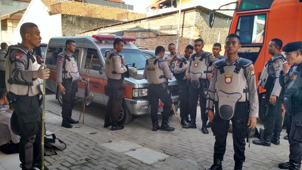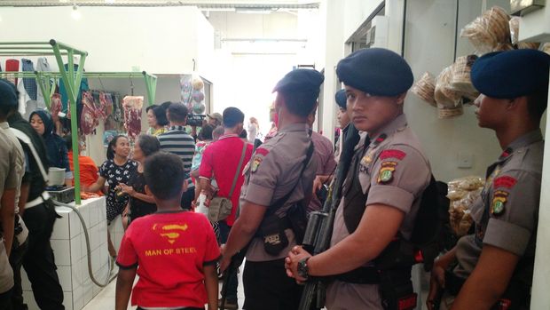 Para personel polisi melengkapi dirinya dengan tameng dan bambu pemukul. Mereka bersiaga di sudut-sudut pasar, Selasa (13/9/2016). Sebagian dari mereka ada pula yang menenteng senjata laras panjang.