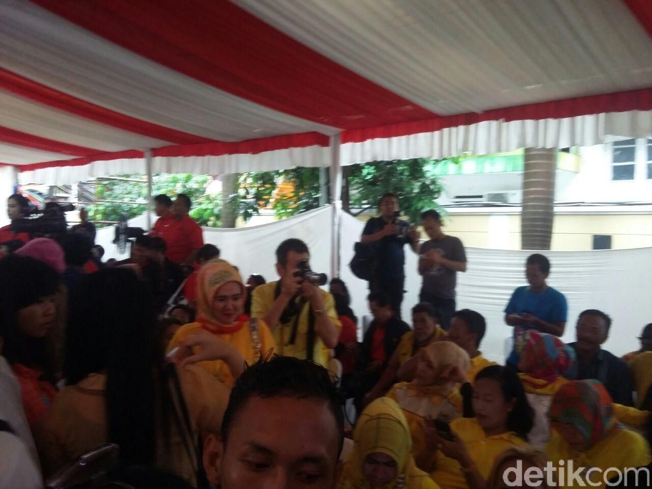 Pantauan detikcom, Rabu (21/9/2016), ratusan pendukung memadati halaman KPU. Meski diguyur hujan deras, mereka tak henti menyuarakan yel-yel dukungan untuk Ahok-Djarot. Mereka datang dari partai pengusung dan pendukung yakni NasDem, Hanura, Golkar, dan PDIP.