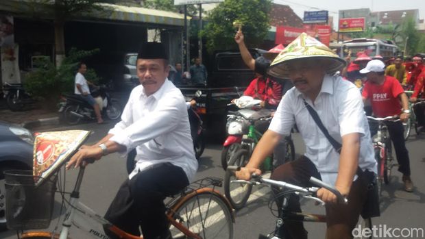 Datang ke KPU dengan bersepeda sekitar 3 KM, pasangan bakal calon Walikota tersebut dikawal pendukungnya dengan bersepeda onthel, andong, berkuda dan sebagian dengan kendaraan motor roda dua.