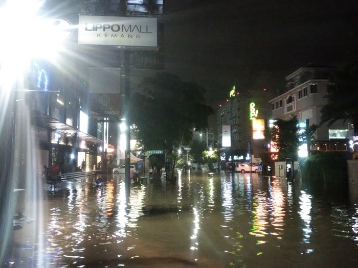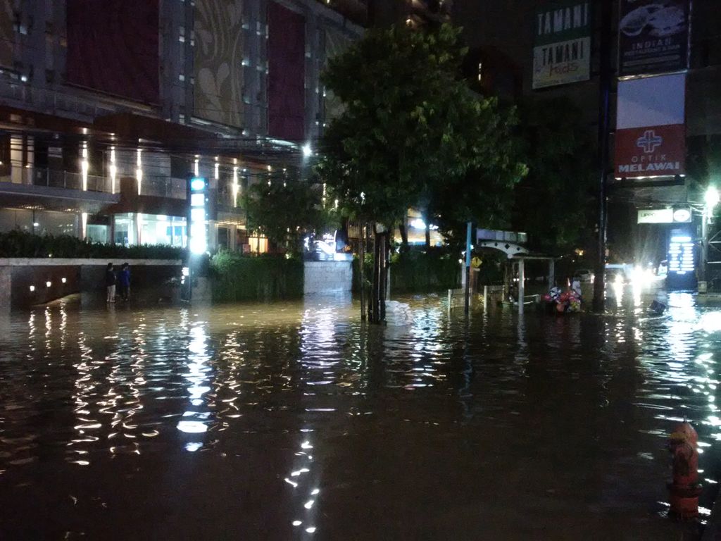 Terpantau di depan Kemang Square, Jalan Kemang Raya, Jakarta Selatan, Minggu (25/9/2016) pukul 22.10 WIB, air masih menggenang, paling tinggi sekitar 60 centimeter.