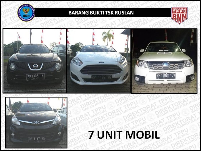 Sementara dari tersangka Ruslan, barang bukti yang disita yaitu 3 unit ruko di Batam senilai Rp 2.250.000.000, 1 unit rumah di Batam senilai Rp. 300.000.000, 7 unit mobil senilai Rp 1.000.000.000, perhiasan emas senilai Rp 100.000.000, uang tunai Rp 2.500.000.000.