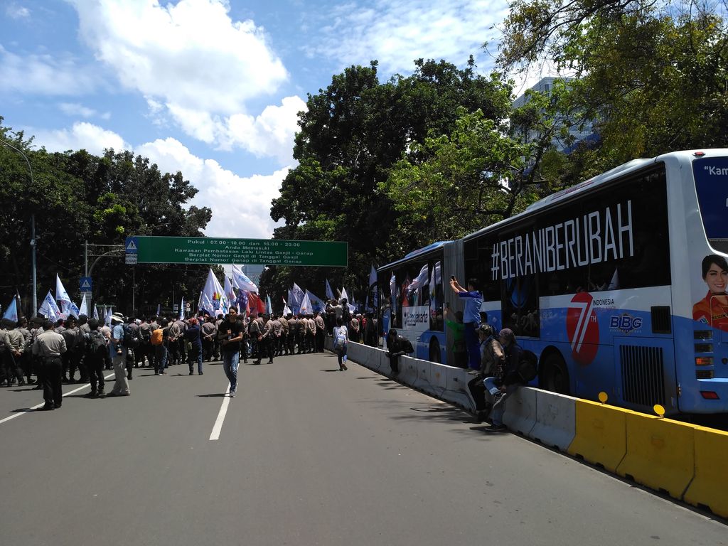 Kendaraan yang beroperasi normal karena adanya pendemo ini yakni bus Transjakarta. Bus Transjakarta di sepanjang Jl Medan Merdeka Barat tetap jalan. Penumpang bus Transjakarta terlihat tidak sepadat jam sibuk berangkat dan pulang kerja.