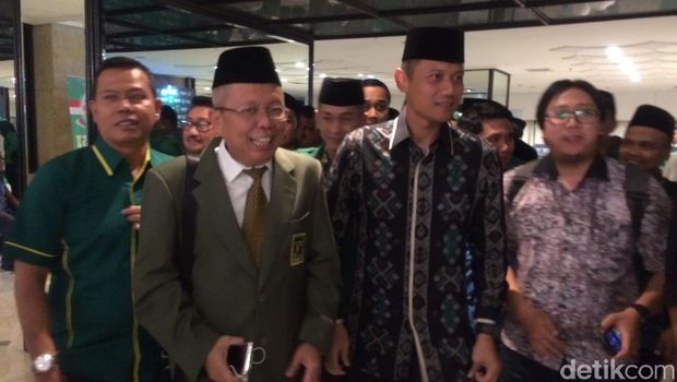 Cagub DKI Agus Harimurti hadir dalam Musyawarah Kerja Nasional (Mukernas) I PPP di Hotel Mercure Ancol, Senin (3/10/2016) sekitar pukul 19.00 WIB. Agus yang datang dengan mengenakan baju batik berwarna abu-abu dan coklat serta peci hitam, disambut oleh Sekjen PPP Arsul Sani yang sudah menunggu kedatangan Agus.