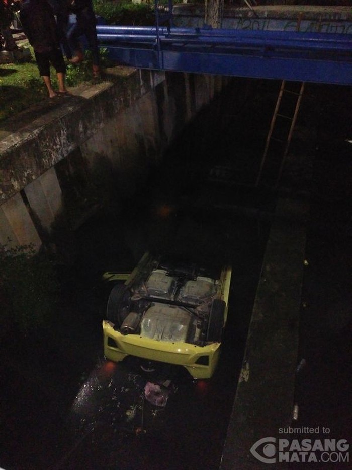 Sebuah mobil Honda Jazz berwarna kuning nyemplung ke Kali Cideng, Jakarta Pusat. Akibat peristiwa ini, empat orang penumpang mobil ini luka-luka dan dilarikan ke rumah sakit.