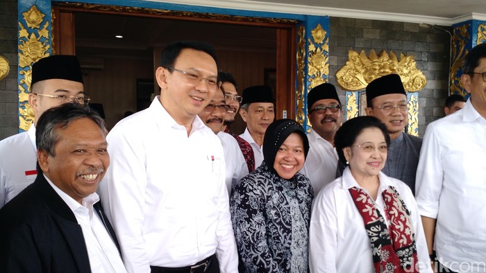 Saat itu, tampak Megawati duduk diapit di antara Ahok dan Risma. Di sebelah Risma ada Hana Fadel Muhammad dan berdampingan dengan Rano Karno.