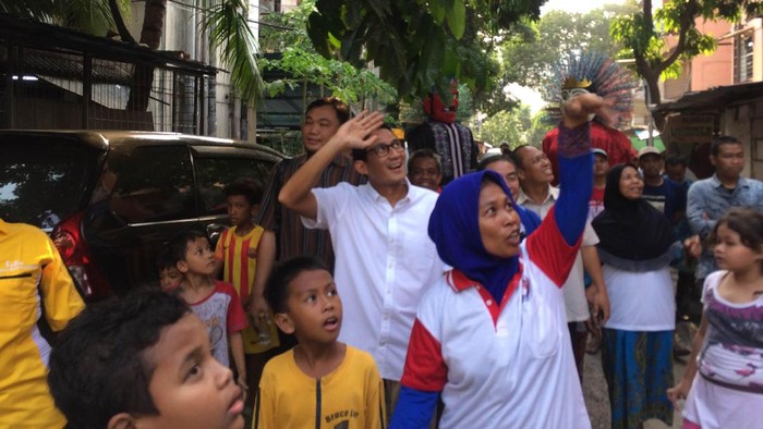 Sandi yang datang sekitar pukul 15.30 WIB disambut oleh kesenian tradisional khas Betawi, ondel-ondel. Sandi sendiri sempat ikut berjoget bersama ondel-ondel. Melihat Sandi, warga langsung menyemut untuk berfoto dan menyalami Sandi.