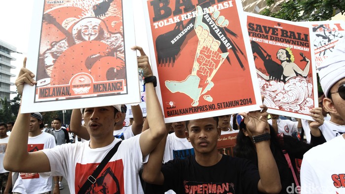 "Masyarakat Bali selalu memasang baliho tolak reklamasi, tentara dan polisi turun untuk membalikan baliho tersebut. Sejak kapan tentara yang punya kehormatan kerja untuk membalikkan baliho," Jelas Gendo sambil menunjukkan foto-foto aparat menertibkan baliho di Bali.