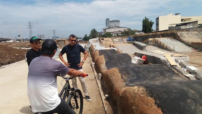 Saat detikcom mengunjungi lokasi, terdapat lima orang sedang mengecek skateboard park dengan sepeda dan papan skateboard. Mereka berbincang dengan pekerja proyek.