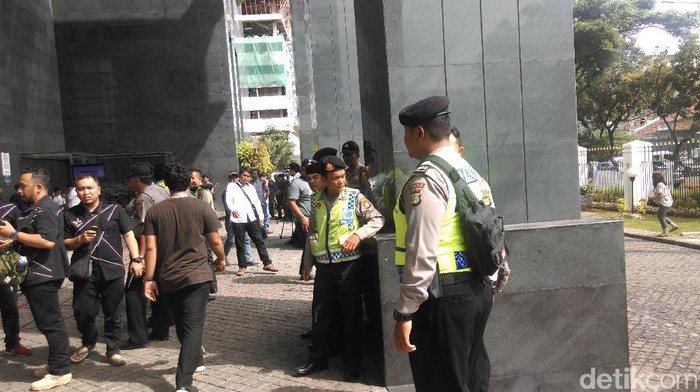 Jelang sidang, para personel kepolisian berjaga di dalam dan di luar gedung. Mobil barracuda juga tampak disiagakan di halaman PN Jakarta Pusat dengan mobil polisi terparkir di sampingnya.