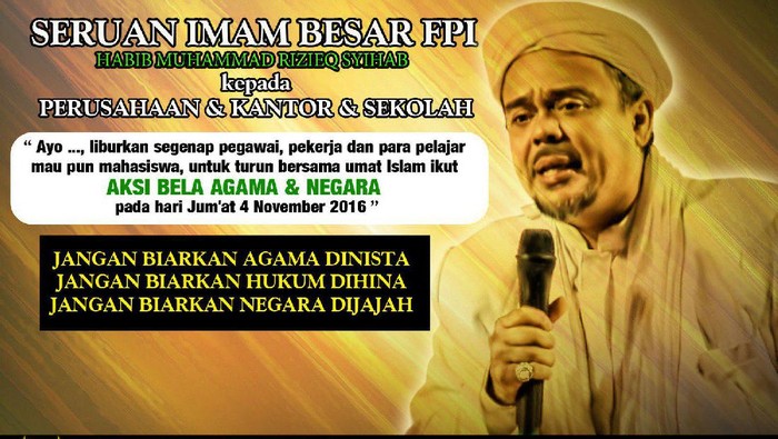 Demonstrasi 4 November direncanakan akan dihadiri oleh ribuan masa dan akan terkonsentrasi di Istana Negara. Demo tersebut terkait dugaan penistaan agama yang dilakukan Cagub DKI incumbent Basuki T Purnama (Ahok).