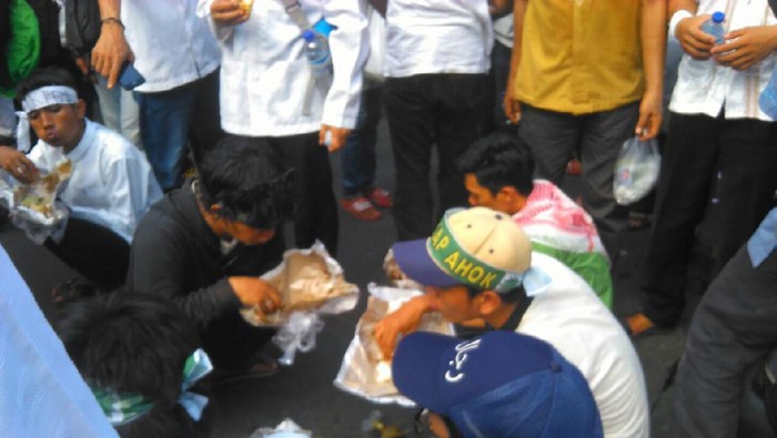 Pantauan detikcom di lokasi, Jumat (4/11/2016), sebagian massa pendemo tengah menikmati menu makan siang mereka di ruas jalan depan Gedung Balai Kota. Duduk di tengah jalan, mereka tampak lahap menikmati nasi dengan lauk ayam itu.
