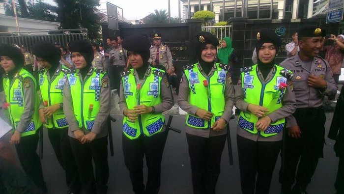 Semua Polwan berjilbab itu mendapat mawar merah. Mereka lalu memegang mawar merah itu sambil tersenyum-senyum.