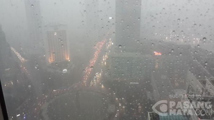 Informasi yang dikumpulkan dari berbagai sumber, Kamis (10/11/2016), hujan deras, angin kencang dan petir terjadi di Pondok Indah, Jakarta Selatan. Jarak pandang di kawasan tersebut terbatas.