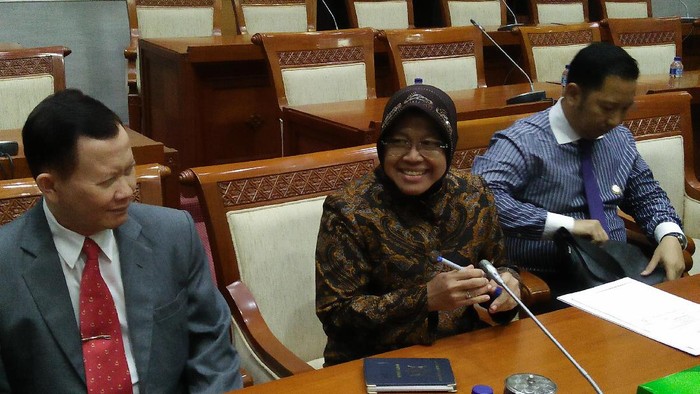 Mengenakan kemeja batik, Risma bergegas memasuki ruang Komisi III DPR di Gedung Nusantara II, kompleks Senayan. Ketua Komisi III DPR Bambang Soesatyo memastikan Risma diundang oleh Panja Penegakan Hukum terkait Pasar Turi.