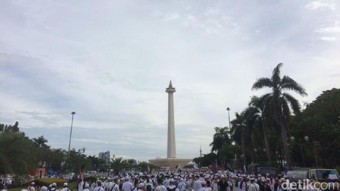 Pantauan di lokasi aksi, Jumat (2/12/2016), massa aksi damai berdiri secara serempak setelah dikomando untuk menyanyikan lagu Indonesia Raya. Pimpinan aksi seperti Habib Rizieq Shihab, dan petinggi GNPF MUI lainnya ikut berdiri dan menyanyikan lagu kebangsaan Indonesia itu.