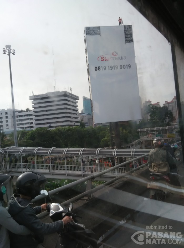 Belum diketahui maksud dan tujuan pria itu berdiri di atas baliho sembari mengibarkan bendera merah putih. Ia juga sempat memasang spanduk hitam bertuliskan, "Jual organ tubuh, selamat hari HAM", juga spanduk hitam satunya bertuliskan, "Tangkaplah daku, akan aku berikan pembunuh anak yatim piatu padamu DPR, KPAI, KPP/PA". (adf/dnu)