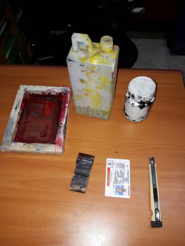 Polisi kemudian bergerak dan menangkap Sanwani di rumahnya di kawasan Kramatjati, Jakarta Timur. Di situ, polisi hanya menemukan peralatan sablon dan sebuah pisau cutter.