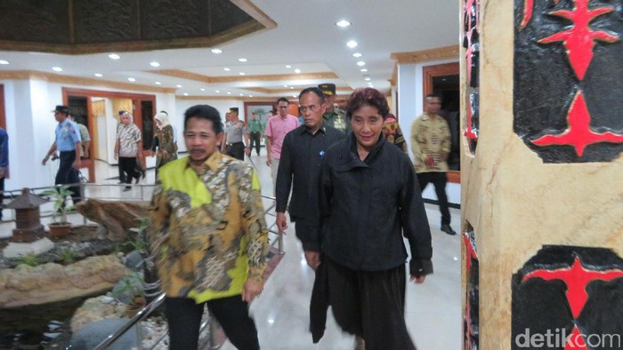 "Wah panjang sekali yang nyambut. Jadi merasa seperti pejabat saya," kata Susi sambil tertawa saat disambut para pejabat daerah.