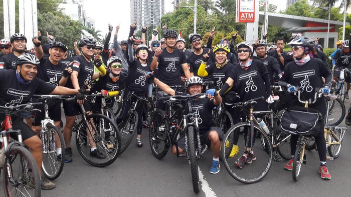 Para pendukung mereka kompak memakai kaos hitam dengan tulisan 'Share the Road' sementara di antara anggota komunitas sepeda ada yang memakai baju ala pejuang kemerdekaan.