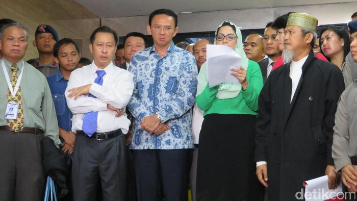 Ahok dan tim pengacara keluar dari auditorium gedung Kementerian Pertanian, Jl RM Harsono, Ragunan, Jakarta Selatan, sekitar pukul 00.00 WIB, Rabu (11/1/2017). Dia sempat berdiri bersama tim pengacara dan juru bicaranya, Triana Dewi Seroja, lalu bergegas meninggalkan lokasi.