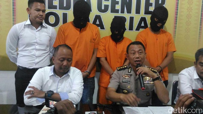 Demikian disampaikan, Kabid Humas Polda Riau, Kombes Guntur Aryo Tejo didampingi Kasubdit 3 Jatanras AKBP Fibri kepada wartawan, Selasa (17/1/2017). Guntur menjelaskan, ketiga tersangka adalah TD (33), Y (33), dan DL (30). Satu pelaku lainnya berinisial HP masih jadi buron.