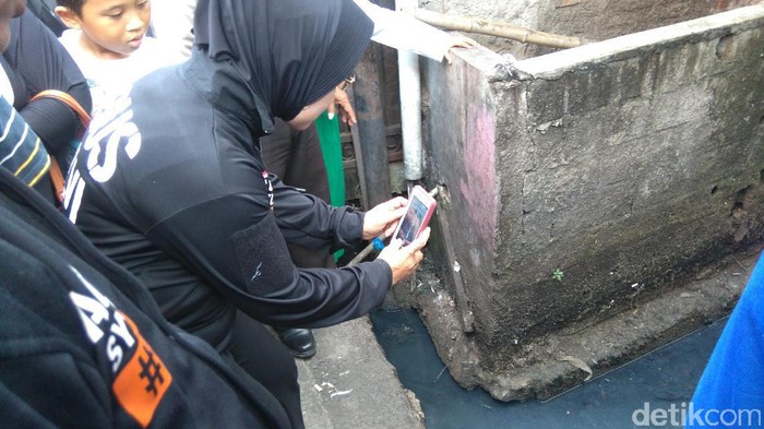 Sylviana Murni melihat saluran di Kramat Pela. (Muhammad Fida Ul Haq/detikcom)