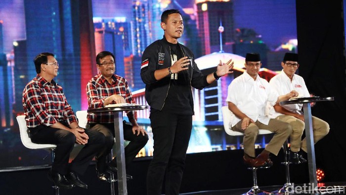 Pasangan calon gubernur dan wakil gubernur nomor urut 1 mendapat giliran pertama. Agus Yudhoyono didampingi Sylviana Murni pun berdiri.