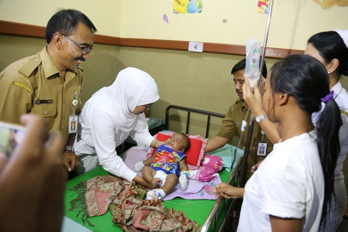 Khofifah lalu mengusap kening bayi yang diketahui diberi nama akhir Selamet. Selamet bisa bertahan hidup diduga karena ia berada di dalam pelukan sang kakek yang tewas ketika ditemukan pada Sabtu (11/2) lalu.
