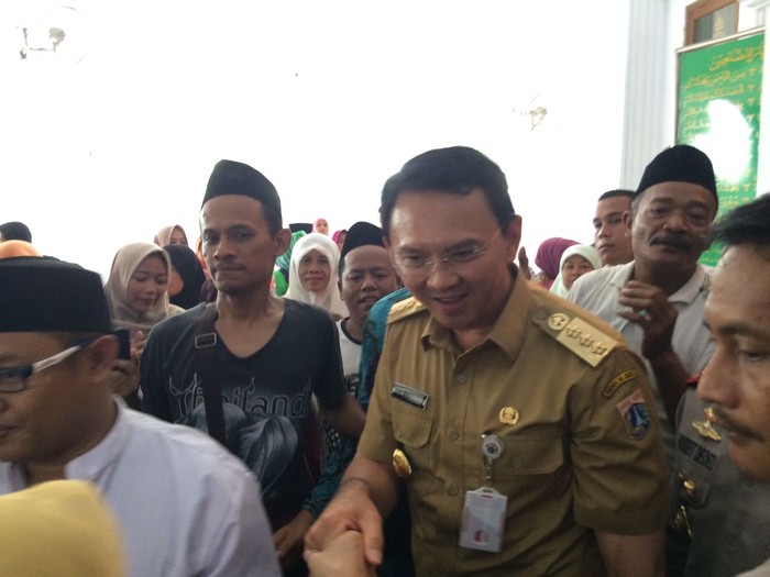Sekitar 30 menit kemudian, Ahok keluar dari area makam Mbah Priok. Kedatangan Ahok menyedot perhatian para santri, jemaah, dan pengunjung makam Mbah Priok.