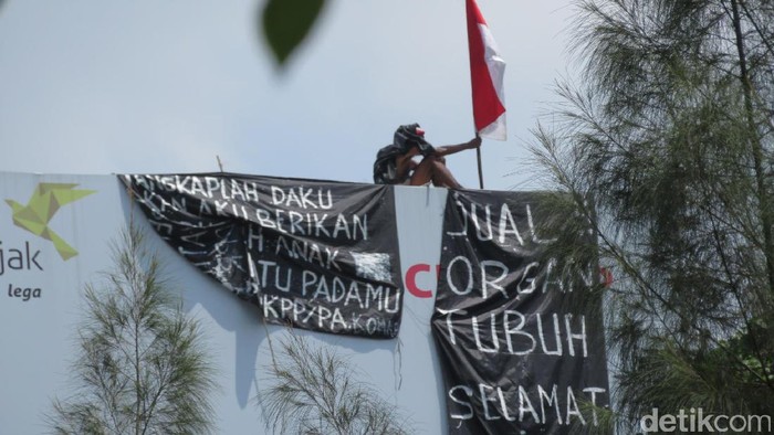 "Kemarin polisi sempat datang dari pukul 10 sampai pukul 5 sore. Ada juga yang naik minta dia turun, tapi malah disodok pakai bambu," ujar Edi.