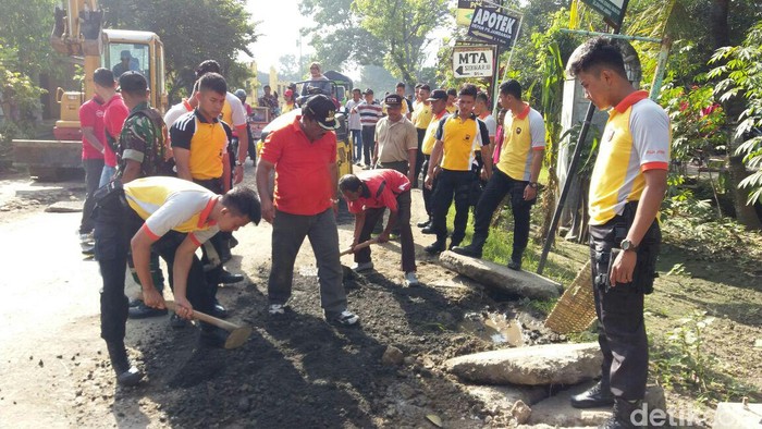 Bersama pejabat, PNS, perangkat desa, personel TNI-Polri, dan warga sekitar Pungkruk, Sragen, Yuni—panggilan akrab Kusdinar Untung Yuni Sukowati, menambal jalan rusak sepanjang 1,5 km di pintu tol Jalan Pungkruk, Kecamatan Sidoharjo.
