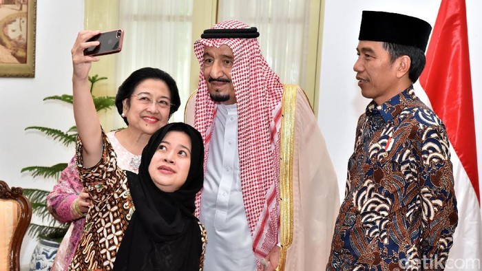 Tak sekedar bertemu. Raja Salman, Jokowi beserta Mega dan Puan melakukan wefie. Foto: Agus Suparto