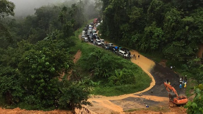 Badan jalan nasional tersebut kini tertutup longsoran tebing. Di antara 7 titik longsoran itu, dikabarkan banyak kendaraan yang terjebak.