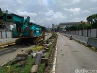Terlihat ada ekskavator berwarna biru dan truk Fuso serta material yang ditumpuk di median jalan berupa jalur hijau. Meski dualajur busway ditutup, siang ini tak tampak ada kemacetan karena penyempitan jalan.