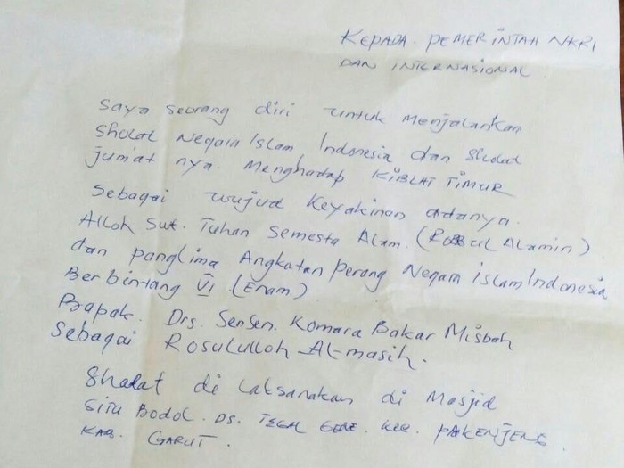 Dalam surat kontroversial tersebut Wawan memberitahukan dirinya bersama pengikutnya melaksanakan ibadah salat lima waktu dan salat Jumat menghadap ke arah timur sebagai kiblatnya. (fdn/fdn)