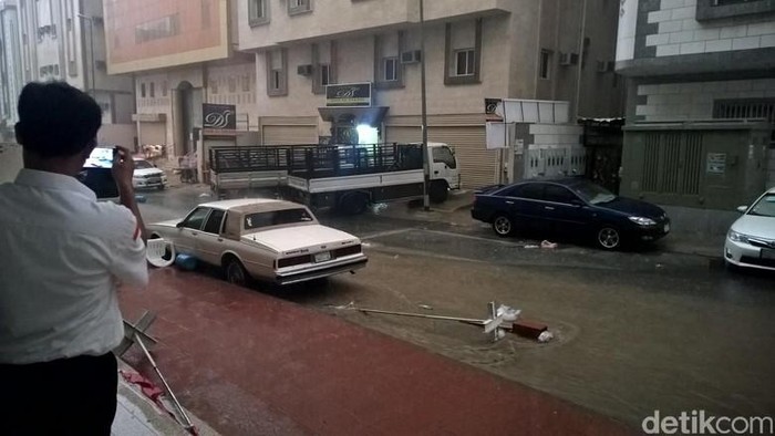 Hingga setengah jam berlalu, hujan deras yang disertai angin kencang masih berlangsung. Genangan air juga mulai bermunculan di pinggir-pinggir jalan Kota Mekah. Jemaah haji Indonesia kemudian diungsikan ke Terminal Bus Syub Amir.