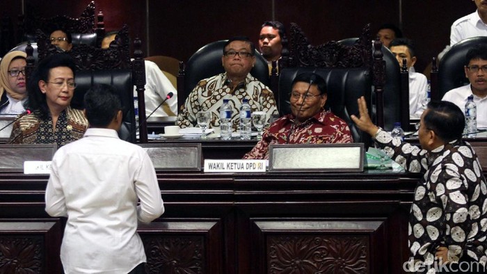 Sidang rapat paripurna DPD sempat diwarnai kericuhan, dari aksi saling mendorong sebelum rapat hingga hujan interupsi saat rapat. Saat ini, rapat paripurna masih diskors. (dkp/imk)