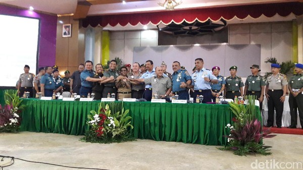 Rapat ini digelar Aula Sudirman, Kodam Jaya, Jl Mayjen Sutoyo, Cawang, Kramat Jati, Jakarta Timur, Kamis (13/4/2017). Sebelumnya dilakukan konferensi pers pukul 09.00 WIB terkait keamanan untuk pilkada mendatang.