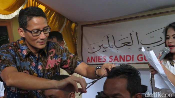 Acara tasyakuran digelar di Jalan Usman, Kelapa Dua Wetan, Ciracas, Jakarta Timur, Senin (24/4/2017). Acara ini juga dihadiri politikus Gerindra, Syarif. Selain memotong rambut, Sandiaga juga diberikan 'tongkat komando' oleh PAC Gerindra.