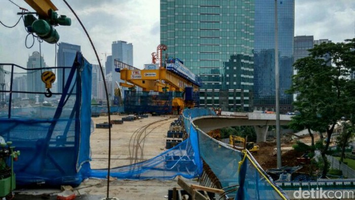 Pantauan detikcom di lokasi, Jl Jenderal Gatot Subroto, Semanggi, Jakarta, Rabu (26/4/2017), proses pembangunan proyek simpang susun ini masih berlangsung. Sejumlah pekerja pun tampak melakukan aktivitas menyelesaikan proyek yang akan menjadi ikon Jakarta ini.