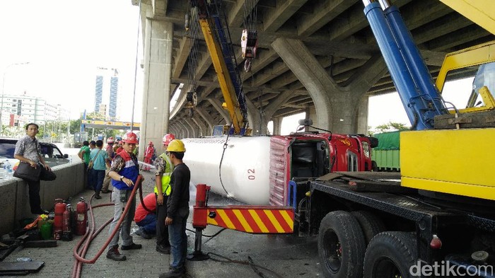 Saat ini petugas sedang mengevakuasi truk tersebut menggunakan dua buah truk mobile crane. Pantauan di lokasi, arus lalu lintas di kedua arah masih berjalan lancar. (jbr/dhn)