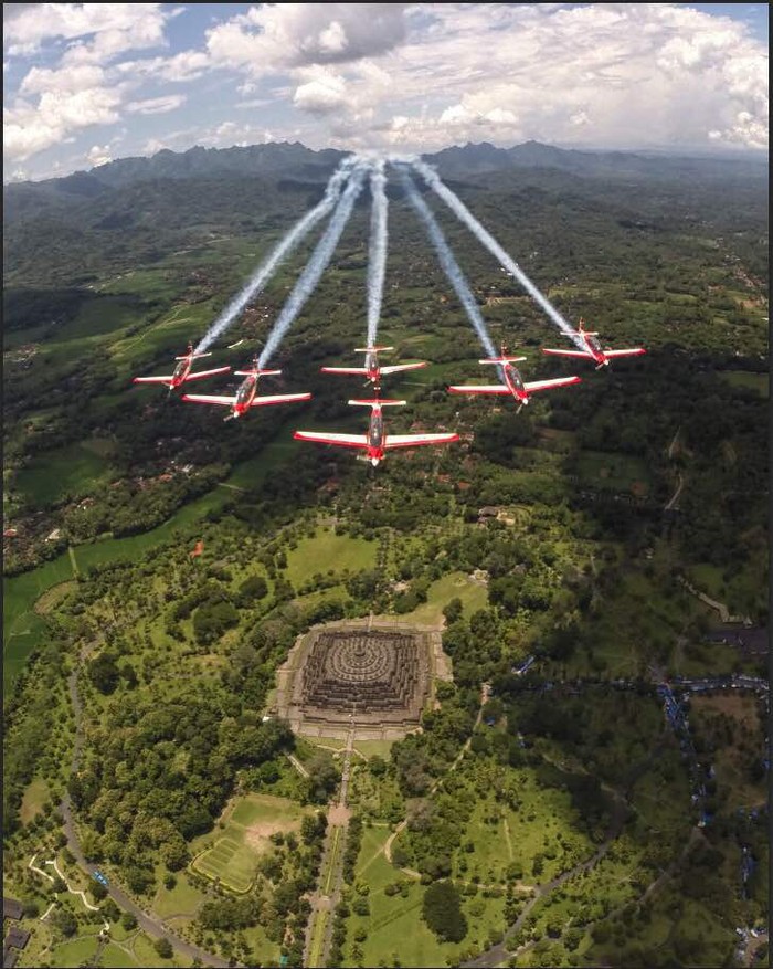 Bukan hanya di Prambanan, tim Jupiter juga pernah terbang di atas Candi Borobudur dengan formasi arrow head. Momen tersebut diabadikan dari atas dan kita bisa melihat pemandangan indah dari atas kokpit.