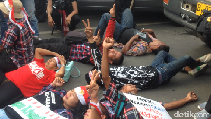 Berdasarkan pantauan detikcom di depan Rutan Cipinang, Jaktim, Selasa (9/5/2017) sekitar pukul 15.00 WIB, massa awalnya sempat duduk di jalan. Kemudian, sebagian kecil dari mereka melakukan aksi tiduran.